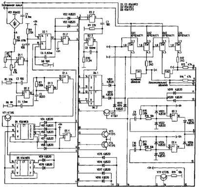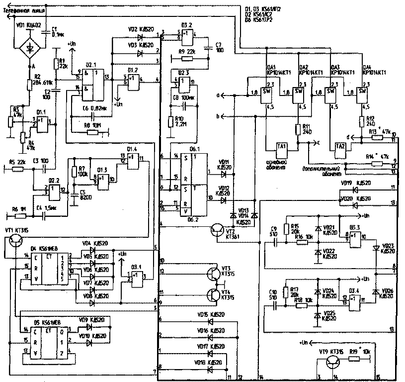 Устройство состоит из трех функционально законченных блоков:базового и двух сервисных - блока учета времени разговора и блока анализа выхода на межгород. Рассмотрим работу базового блока (рис. 1). При поступлении индукторной посылки вызова, на выходе диодного моста VD1 (точка А) появляется импульсное напряжение амплитудой 120 В и частотой 25 Гц. Длительность импульса - 1с, пауза - 4с. Компаратор D1.1 преобразует это напряжение в серию прямоугольных импульсов уровня МОП ИМС. С выхода D1.1 импульсы подаются на одновибраторы D2.1, 02.2. Одновибратор D2.1 имеет постоянную времени, равную 5 с, т.е. периоду индукторных посылок. Одновибратор D2.2 преобразует импульсы с выхода компаратора в одиночный импульс длительностью 1 с. В режиме ожидания входящего вызова оба абонента подключены к телефонной линии через открытые ключи DA1...DA4. Открывает ключи уровень логической "1", поступающий с выхода элемента D1.2 через транзистор VT2 и диоды VD13, VD14. При приходе первой индукторной посылки срабатывает одновибратор D2.1, в результате чего на его выходе появляется уровень логической "1", а на выходе инвертора D1.2 - логический "О". Уровень "1" через диоды VD2, VD3 поступает на входы R триггеров D6.1, D6.2, сбрасывая их в ноль и тем самым отключая обоих абонентов от телефонной линии. В этот момент производится определение,к какому абоненту - основному или дополнительному - адресуется вызов. Если вызов идет к основному абоненту, индукторная посылка с выхода одновибратора D2.2 через схему задержки D1.3, D1.4 и открытый ключ VT1 поступает на счетчик D4. После подсчета пяти импульсов счетчик самоблокируется по входу V. С выхода 5 (вывод 1) D4 логическая "1" через диод VD8 поступает на вход S (вывод 14) триггера D6.1, устанавливает его в "1" и тем самым открывает ключи DA1, DA2, подключая к телефонной линии основного абонента. Одновременно с выхода инвертора D3.1 уровнем логического "О" обрывается импульс по выходу D2.1. При снятии трубки основным абонентом в цепи телефонного аппарата начинает протекать ток. При этом на резисторе R11 падает напряжение около 8 В относительно общего провода, что соответствует паспортным данным уровня логической "1" МОП ИМС. Резисторы R11, R12 не оказывают какого-либо влияния на работу телефона, и их номинал может варьироваться в небольших пределах для подбора напряжения, при котором происходит четкое срабатывание логики. Напряжение с резистора R11 подается через диоды VD15, VD16 на вход S D6.1 и вход R D6.2. В результате основной абонент постоянно подключен к телефонной линии, а дополнительный - отключен. В принципе, диод VD15 может быть исключен из схемы, т.к. на вход S D6.1 поступает уровень логической "1" с выхода 5 D4. Для более надежной блокировки телефонного аппарата дополнительного абонента в схему включены ключи VT2...VT4. Ключ VT2 отключает выход инвертора D1.2 при поднятии трубки, а ключ VT3 дополнительно "сажает" на землю резистор R12. По окончании разговора основным абонентом, когда он кладет трубку на телефонный аппарат, по спаду уровня логической "1" на резисторе R11 срабатывает формирователь импульсов на элементе D3.4. Уровнем логической "1" с выхода формирователя сбрасываются счетчики D4, D5, подготавливая устройство к очередному приему вызова. Счетчик D5 при вызове основного абонента на работу схемы влияния не оказывает. Он необходим для управления ключом VT1 и сохранения результата подсчета первой серии индукторных п