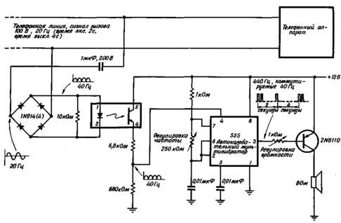 Использование оптрона для передачи сигнала вызова к отдельному вызывному устройству позволяет предотвратить перегрузку телефонной линии, избежать недоразумений с телефонной компанией и сохранить работоспособность линии, принимающей сигнал. Посредством оптрона можно также включать и другие устройства - такие, как аппарат для записи телефонных сообщений. Вызывное устройство потребляет ток 10 мА по вызывному сигналу и почти не нагружает линию по речевым сигналам постоянного тока.